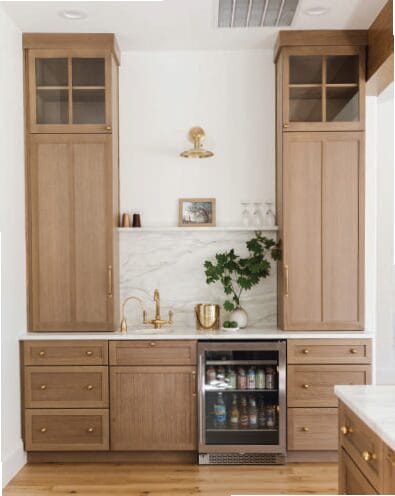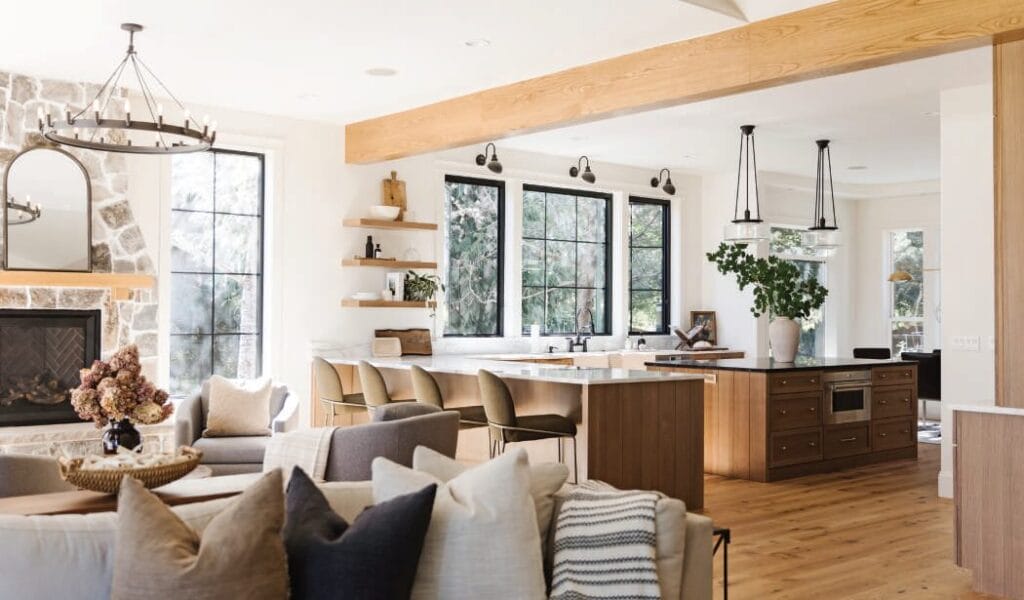 “The inspiration was bringing nature inside,” explains Erin. “I wanted to see a tree from every window, and we did that.” The extra windows added natural light and complemented the interior’s materials. There are no plastics or acrylics,” says Erin. “My husband had one request which was woodpecker white oak for the floors.” They were laid throughout the house.